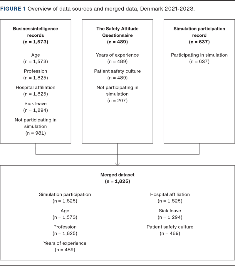 The SAQ included 489 observations on gender, profession, years of experience, hospital type and patient safety culture. BI records contained 1,573 observations on gender, profession, age, sick leave and hospital type. After merging, the final dataset comprised 1,825 unique observations. Key variables were simulation participation (n = 1,825), gender (n = 1,825), profession (n = 1,825), years of experience (n = 489), hospital type (n = 1,825), sick leave (n = 1,294), age (n = 1,573) and SAQ dimensions (n = 489). Simulation participation was based on electronic records, including 637 participants.