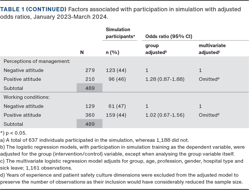 Counts and proportions described categorical variable distributions, while logistic regression identified factors associated with simulation participation. Sociodemographic variables (gender, age, profession, experience, hospital type) and additional factors (sick leave rate, SAQ dimensions) were analysed separately to maximise sample size and minimise listwise deletion. All analyses were adjusted for the intervention/control group.