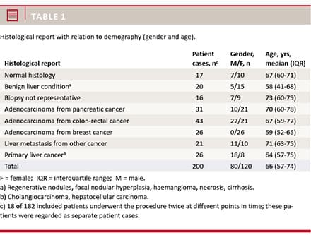 The present study included a total of 182 referred patients who completed 200 consecutive US-guided 18G Tru-Cut liver biopsy procedures performed during a four-year period (from January 2010 through December 2013) at our institution. Eighteen of the included patients underwent the biopsy procedure twice at different time points (either due to a non-representative biopsy sample or a follow-up biopsy in relation to disease progression). We considered these patients as separate patient (biopsy) cases. A total of 80 male and 120 female patient cases with a median age of 66 years (interquartile range: 57-74 years) were enrolled in this study. Prior to the biopsy procedure, 171 of the included patient case (153 patients) had already been diagnosed with a cancer disease. The histological evaluation of the biopsies revealed 121 cases with liver metastasis, of which colorectal, pancreatic and breast cancer were the most frequently diagnosed cancer diseases. The detailed histological results are depicted in Table 1. In addition, the number of insertions per procedure is shown in Table 2. Two thirds of the 200 biopsy procedures were completed in a single puncture, and less than 10% required three or more needle punctures.