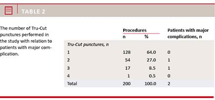 Two major complications were registered in a total of 200 procedures. Both complications were due to post-biopsy bleedings with non-fatal outcomes. One patient case was treated with saline infusion (SIR C). The other case required more demanding therapies and had a longer hospitalisation (SIR D). The patient cases are described in the following.
