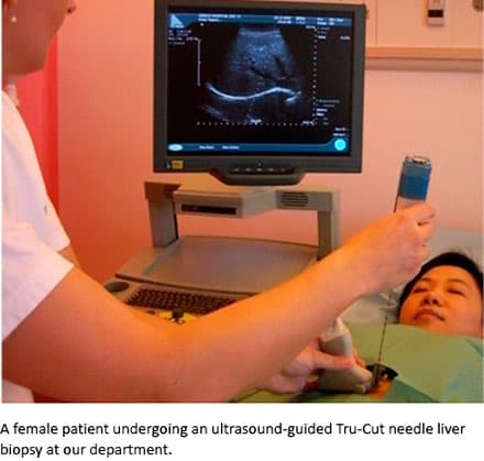 Despite recent advances in medical imaging, percutaneous coarse-needle liver biopsy remains the gold standard for diagnosis of focal liver lesions [1]. However, liver biopsy is associated with a risk of potentially serious complications such as bleeding [2]. The latest European guideline (2004) from the British Society of Gastroenterology recommends that this procedure shall be performed on an in-patient basis or an out-patient basis with a six-hour post-biopsy observation period [3]. Following this recommendation makes the procedure both expensive and time-consuming. Recent recommendations (2009) from the United States suggest that this observation time may be reduced to four or two hours [4]. Supported by previous studies with a short observation time [5-7], we considered that ultrasound (US)-guided Tru-Cut liver biopsy performed under appropriate conditions could be safely performed as a fast-track ambulatory procedure with an observation time of one hour. In contrast to previous studies [5-7], we added a Focused Assessment with Sonography for Trauma (FAST) scan before discharge of the patient in order to detect any acute major and clinically important complications [2, 8]. Included in our algorithm was a short-term (2-3 weeks) patient revisit follow-up to register any delayed onset of major complications.