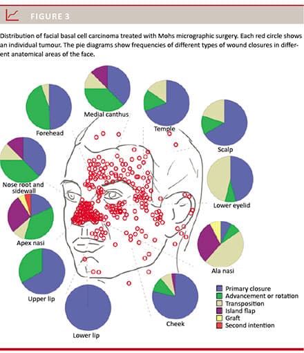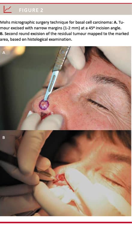 Dermatologic surgeons performing excisions of BCC in the face are limited in their choice of closure techniques for skin defects. We have been particularly cautious regarding the use of asymmetric flaps, such as transposition, island and rotational flaps. These types of closures distort the geometry of the initial defect and make it very difficult to trace residual tumours in case of incomplete excision and relapse. MMS obviates this problem because microscopically free margins are ensured before closure. In the rare cases of tumour regrowth after MMS, relapses can be re-excised with MMS, which allows tracing of residual cancer independently of the depth of invasion and shape.