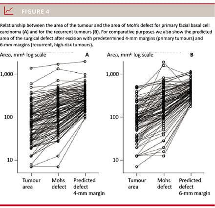 MMS was tissue-sparing comparing with a standard excision with pre-determined margins. After Mohs procedure, the size of the final defect was 1.34-fold the size of the tumour (95% confidence interval (CI): 1.10-1.59). In comparison, an excision with a 4-mm margin (which