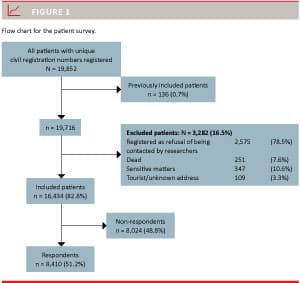 Of a total of 19,852 unique patients, 16,434 (82.8%) were included in the patient survey (Figure 1). A total of 136 (0.7%) were excluded due to previous inclusion, and 3,282 (16.5%) were excluded due to unknown addresses or for discretionary reasons. In total, 8,410 (51.2%) patients returned completed questionnaires. Generally, respondents were younger than non-respondents and excluded patients (Table 3).