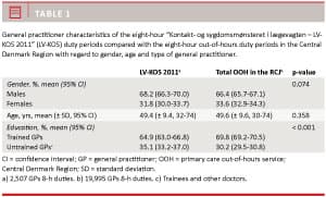 This paper aims to describe the sampling method and the characteristics of GPs and patients in the LV-KOS cohort study. We used a computerised questionnaire in the existing electronic patient record system in the Danish OOH primary care service for our data collection.
