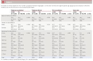 In total, 21,457 contacts were included, making up 2.4% of all contacts to the OOH service during the study period (Table 2). Due to the varying pop-up interval of registrations, the distributions of registered contacts for the four types of contacts are not comparable to the distribution of all contacts to the OOH service. In total, 7,810 contacts (36.4%) were registered as telephone contacts of which 4,620 (59.1%) were completed by telephone, whereas 6,973 (32.5%) contacts resulted in consultations and 6,674 (31.1%) in home visits. Despite almost similar point estimates for distribution of gender and mean age across all contact types, the large number of contacts resulted in statistically significant differences in gender and mean age for telephone consultations (p < 0.001) and in age groups for telephone referrals (p = 0.021) and clinic consultations (p = 0.005) (Table 2). The mean age was higher for patients receiving home visits and lower for clinic consultations. Children aged 0-4 years and adults aged 18-60 years more often had telephone consultations and clinic consultations than other age groups. For all contact types, females comprised a higher proportion than males.