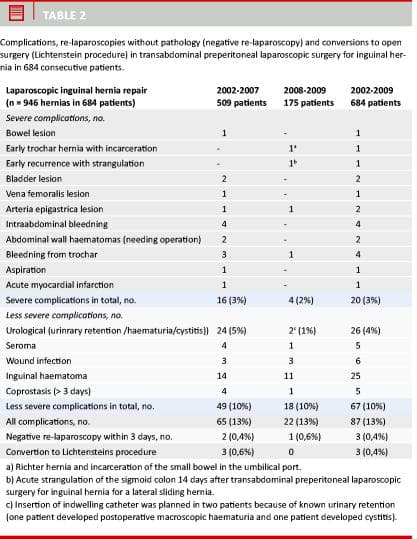Material and methods: This retrospective, single-institution study included consecutive patients during an eight-year period from 1 January 2002 to 31 December 2007 (period I) and from 1 January 2008 to 31 December 2009 (period II). In period II, perioperative indwelling catheter (Foley catheter) was not used routinely. Furthermore, the surgical technique was adjusted, a small team of dedicated TAPP surgeons was established, and two of the surgeons attended prearranged surgical training programmes. Additionally, period II patients were enrolled into structured patient protocols. The primary endpoint was complications within the first 30 days after surgery, and we also registered the rate of reoperation due to recurrence.
