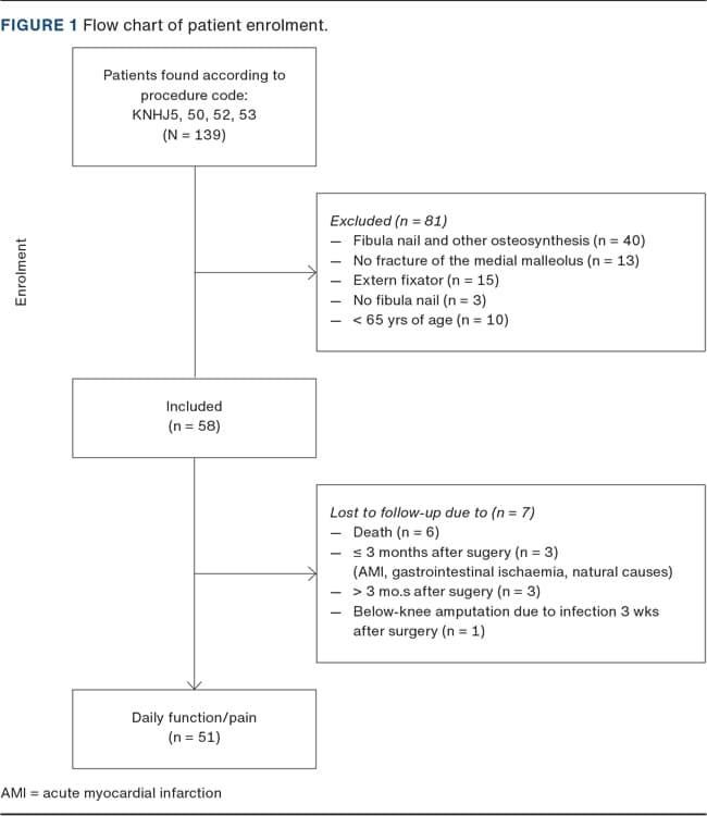 The procedure code for intramedullary nailing of ankle fractures identified 139 patients. We included 58 patients (Figure 1). Fracture type was classified according to the Weber classification and differentiated between open or closed fracture (presence or absence of a wound at the time of the primary examination). Post-operative complications (infection, fracture, dislocation) and mortality were included. At the last follow-up, daily physical function (dependency of walking aid), pain and fracture union were evaluated at a minimum follow-up period of three months after primary surgery. Patients who declined follow-up in the outpatient clinic were interviewed by phone.