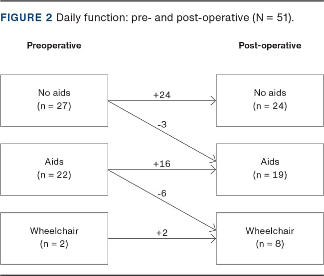 The primary outcome was self-reported limitations in physical function defined by dependency of a walking aid (no aid, crutches/walker or wheelchair) prior to the injury compared with post-operative follow-up.