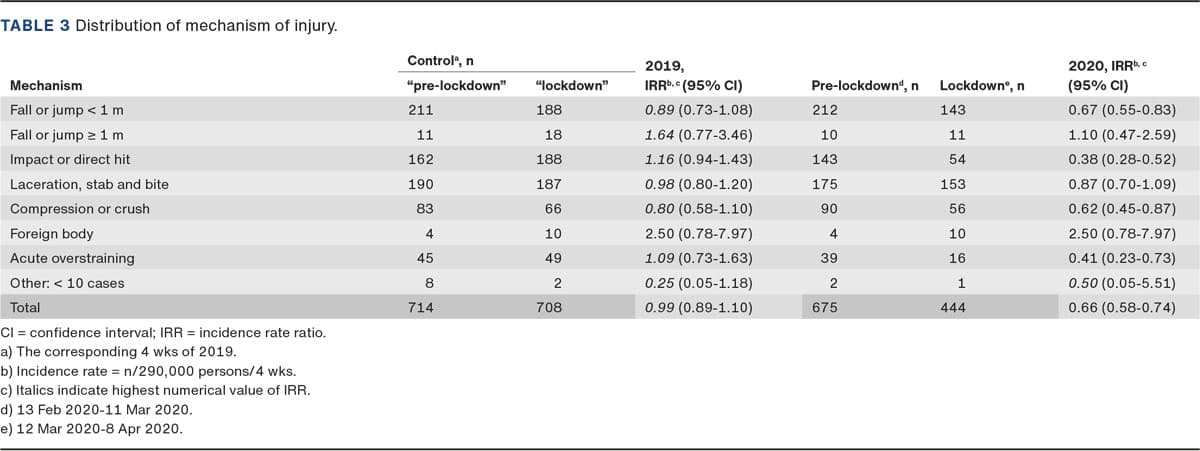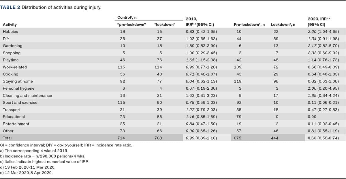 METHODS. We analysed the incident rate ratio (IRR) between the first month of the lockdown with the IRR recorded in the month leading up to the lockdown. We then compared this IRR with the IRR for the equivalent periods of 2019. The outcomes were: diagnoses (or diagnosis groups), activity during injury (ADI), mechanisms of injury, age group and gender. Secondarily, certain specific diagnoses (or diagnosis groups) were analysed by ADI and mechanism of injury.