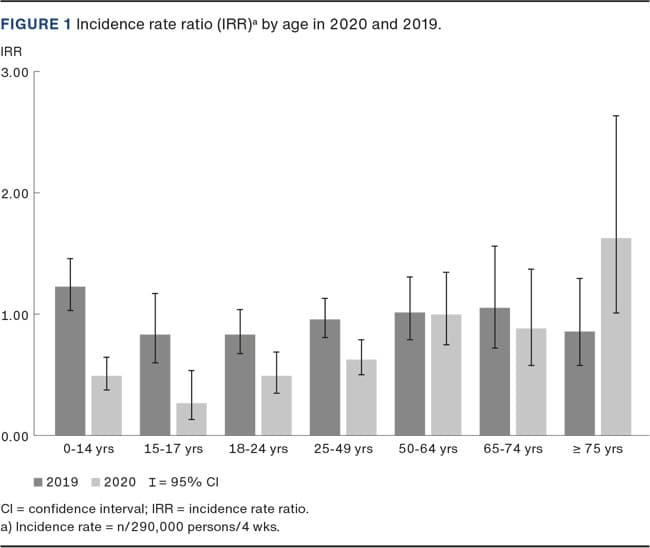 The data were analysed with Numbers 10 for MacOS Catalina. The statistical calculations were based on the assumption of a constant patient population throughout all four periods. We calculated incidence rate ratios (IRRs) before and after the COVID-19 lockdown, covering the corresponding periods of 2019 for: diagnoses (or diagnosis group), mechanisms of injury, ADI, age-groups and gender. The outcome of this study was the comparison of IRRs for 2020 and 2019 for the aforementioned parameters. Additionally, changes in IRRs for injury mechanisms and ADIs were analysed for selected groups. IRR were calculated as follows:
