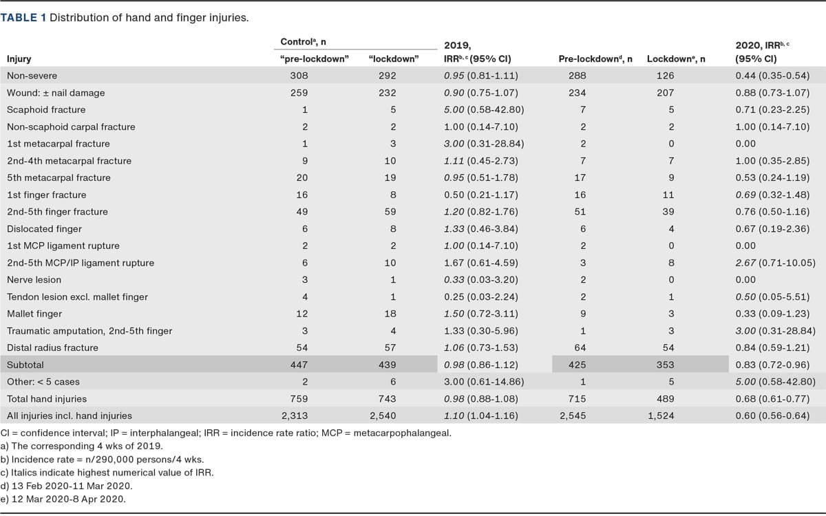 RESULTS. We observed a significant reduction by 30.6% of all hand injuries in 2020. The non-severe injuries had a significant IRR reduction of 58.7% and the severe injuries a reduction of 15.3%, which was non-significant. The IRR in 2020 was significantly lower in 2020 for the age groups: 0-14, 15-17 and 25-49 years. The relative reduction in IRR was markedly larger for men (40.8%) than for women (22.3%), although this difference was not significant.