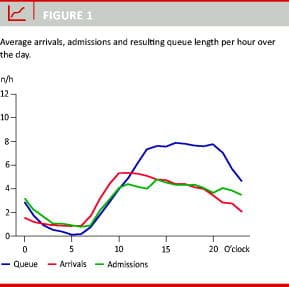The ED is driven by the processes of arrival, admission and discharge. On average the queue resets to zero in the early hours of the morning and rises to eight at noon remaining stable until 8 p.m. Thereafter, until the following morning, admissions prevail over arrivals and the queue goes to zero. On arrival, the average patient is confronted with a queue of 6.6 (Figure 1).