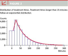 The average treatment time is 61 minutes, excluding reneges (who do not come into contact with medical staff and thus contribute no information about service times and patients with treatment times exceeding five hours (n = 721). The standard hypothesis is that service times obey an exponential distribution. For times not exceeding 15 minutes this does not hold as there are too few of these. However, for treatment times exceeding 15 minutes, we found that frequencies exhibit a perfect exponential decay with a parameter of 0.0185, meaning an average extra service time of 1/0.0185 = 54 minutes (in excess of the initial 15 minutes). The clinical insight this contributes is the following: for a randomly chosen patient at a randomly chosen time, there is a 1.85% chance that the treatment will be completed during the next minute, no matter how long it has already lasted. Also, service times apparently form a perfect continuum with no natural subdivisions.