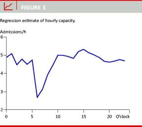 The regression yields a rather constant capacity over the day with an average value of 4.6 patients/hour. I.e. if you are number four in line for service, you will be waiting about 50-60 minutes regardless of the hour. A quite surprising finding since the staffing during the night is only one team versus two teams otherwise.