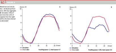We finally simulated the effect of moving two capacity units from the night shift to the later part of the day shift. As demonstrated in Figure 4B, the average queue then dropped from 4.7 to 3.4 patients, implying a 27% reduction in waiting time and, most significantly, in the afternoon where waiting times are too long.