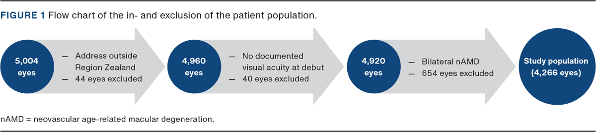 This retrospective study was conducted in Region Zealand, Denmark. Region Zealand serves approximately 840,000 inhabitants and has 17 municipalities, which are further divided into 129 postal codes. There are two public ophthalmology departments in the region that administer intravitreal anti-VEGF treatments. After referral from practising ophthalmologists or other hospital departments, further diagnostic procedures are generally initiated within two weeks, including the final diagnosis of nAMD. Clinical and demographic data were retrieved from the clinical database “Bedre Oftalmologi for Brugere” (BOB), which stores data from the ophthalmology departments in Region Zealand. Patient information included their care pathways, BCVA and treatments.