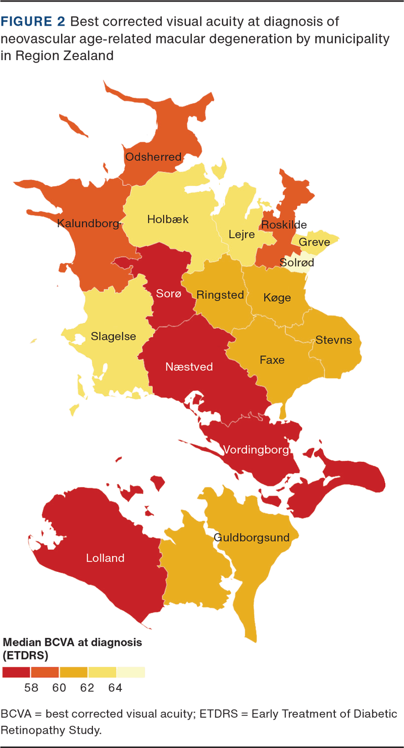 RESULTS. A total of 4,266 eyes with nAMD were included. Variations in BCVA at the time of nAMD diagnosis were found between geographical regions in Region Zealand at postal code level and at municipality level. Furthermore, we found a disparity between municipalities among males and females. However, no statistically significant disparity between postal codes was found among males or females.