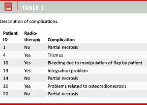 Results: Among the 22 cases studies, seven (32%) experienced postoperative complications. However, 57% of these cases had undergone preoperative radiotherapy. The complications we observed included problems relating to integration, partial necrosis and bleeding. There were no reported complications relating to the donor site.