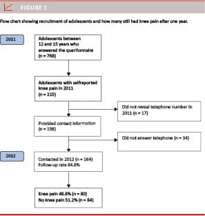 In all, 768 out of the 1,161 potential responders (response rate of 66%) between 12-15 years answered the online questionnaire in September 2011. After one year, adolescents who reported knee pain at first contact were again contacted by telephone and asked if they experienced knee pain, Figure 1. The follow-up interviews were conducted in a structured manner during which the interviewer followed a pre-defined, standardised protocol.
