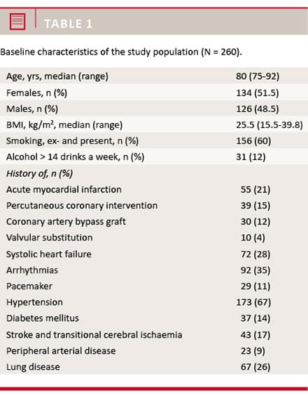 This study forms part of an investigation focusing on early detection of heart failure in the elderly population. It was performed in compliance with the Declaration of Helsinki and approved by the local ethics committee and the Danish Data Protection Agency. For recruitment of patients, the study was announced locally in the Danish Association of Senior Citizens (Ældresagen), in a newspaper article, in our department of cardiology and in a heart failure clinic. The study population was representatives of a mixed and mobile geriatric population. It included a total of 260 subjects aged 75 years old or older. The subjects were recruited from the outpatient clinic and the general geriatric population with risk factors for or with known heart disease, as well as from the healthy background population. Table 1 shows the baseline characteristics of the study participants.