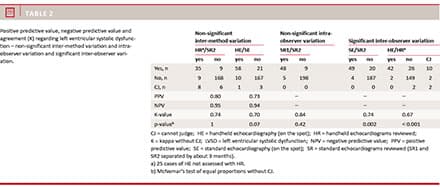 Table 2 shows good agreement on and non-significant inter-method variability of LVSD diagnosed by: 1) all performed standard and hand-held echocardiographies (K = 0.70, p = 0.07), 2) the standard and hand-held echocardiographies performed by the two echocardiographers who did most of the examinations (K = 0.74, p = 0.81) and 3) the reviewed standard and hand-held echocardiograms (K = 0.74, p = 1).