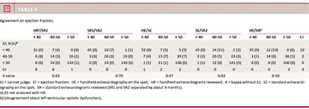 Table 3 shows that regardless of the type of echocardiography (standard versus hand-held), there was considerable disagreement about the exact EF when EF was in the indecisive gray zone about 40-50%. Thus, in the grey zone, the diagnostic variation and inter-observer variability were substantial.