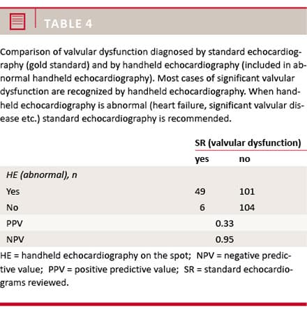 Table 4 shows that hand-held echocardiography had a NPV of 0.95 regarding the presence of significant valvular disease with significant valvular disease as a reference. Whenever hand-held echocardiography was not completely normal, standard echocardiography was recommended. In total, 20 patients out of 55 with valvular dysfunction had also LVSD. Six cases (11%) with significant valvular disease according to standard echocardiography were missed using hand-held echocardiography. One of these patients had a previously unrecognised moderate aortic stenosis and a cardiac murmur; one had a biologic aortic valve and was followed in the out-patient clinic, whereas four were without any significant valvular disorder according to a detailed follow-up using standard echocardiography.