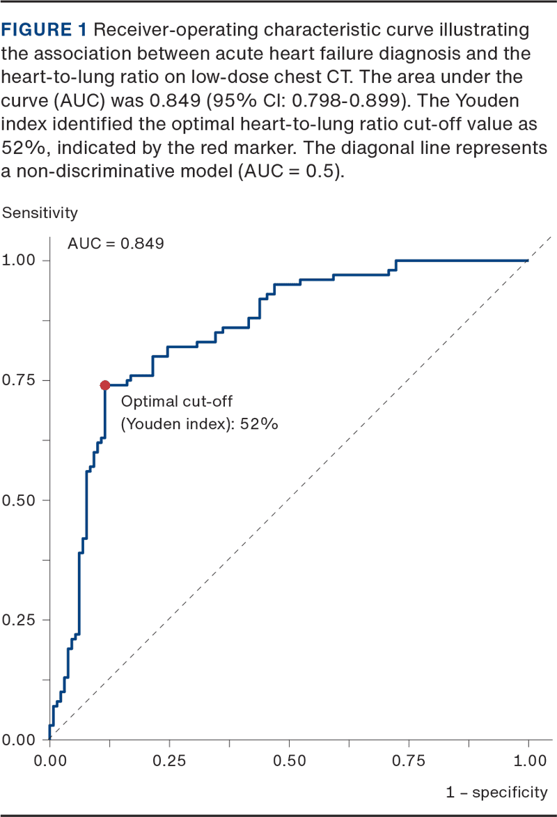 RESULTS. Among 230 patients, 100 were diagnosed with AHF. Using heart-to-lung ratio categorically, 106 had < 50% and 124 ≥ 50%. Using heart-to-lung ratio continuously, a one-percentage-point increase in heart-to-lung ratio was associated with AHF (OR: 1.19, 95% CI: 1.12-1.27, p < 0.001), with an optimal cut-off of 52% (area under the curve = 0.85).