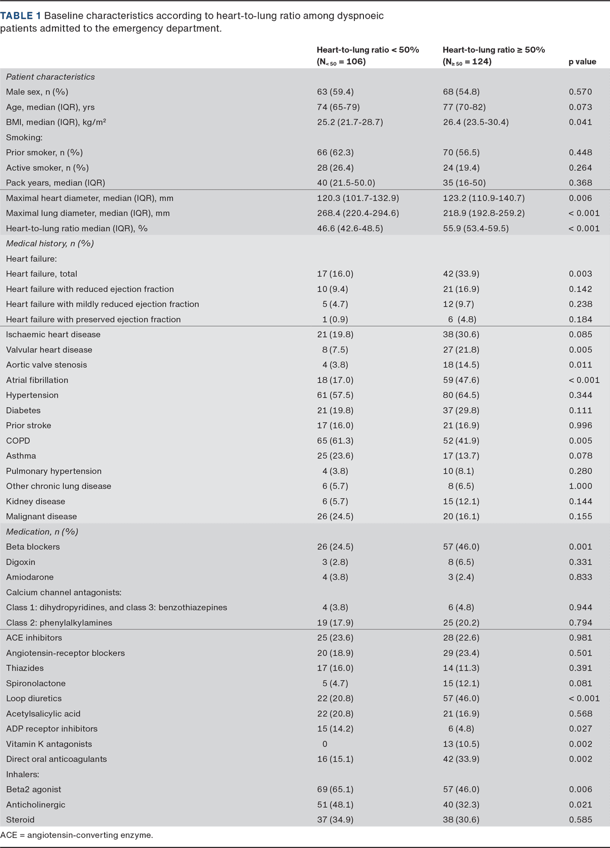Patients with a heart-to-lung ratio of≥ 50% had a higher proportion of comorbidities, including heart failure (p = 0.003), valvular heart disease (p = 0.004) and atrial fibrillation (p < 0.001) (Table 1).