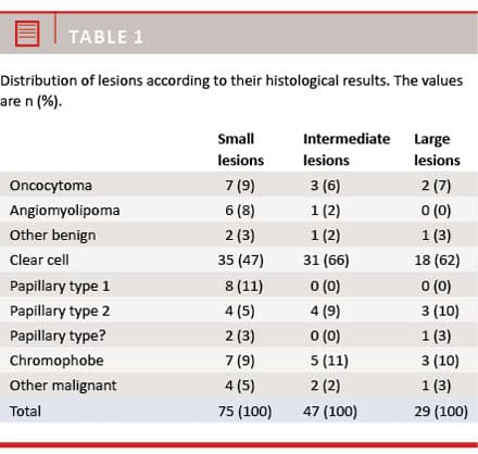 The distribution of lesion subtypes according to their histological results is shown in Table 1. The incidence of clear cell renal cell carcinoma (ccRCC) was 35 (58%) in SL, 31 (74%) in IL and 18 (69%) in LL (p = 0.25). Fuhrman grade was specified in 91.4% of the histology reports. Low malignant tumours were recognised in 40 (76.9%) SL patients, 18 (43.9%) IL patients and 10 (41.7%) LL patients, (p < 0.001).
