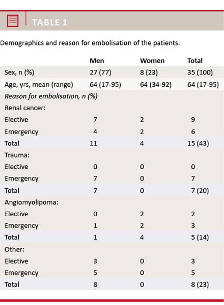 Transcatheter arterial embolisation (TAE) is an effective, minimally invasive treatment, which is associated with low morbidity and mortality [1]. Thus, TAE can be performed in patients with a low performance status [2]. TAE is well-established as an endovascular treatment of urological vascular emergencies such as iatrogenic, traumatic or spontaneous emergencies with or without an underlying pathology [3]. Furthermore, TAE can be used as a prophylactic measurement in high-risk patient with renal angiomyolipoma (AML) and in renal cancer patients pre-operatively to facilitate nephrectomy or as a palliative treatment [2, 4-7]. Previous studies have limitations, i.e. small sample sizes and selection to only one of the mentioned patient groups. The present descriptive study aimed to present the demographics of the patients who underwent renal TAE performed either electively or urgently in a single centre where a dedicated interventional radiology team was on call with 24 hours a day.