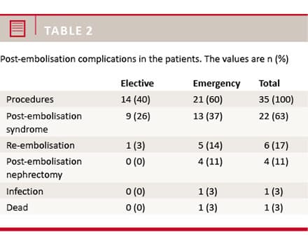 A total of 22 patients (63%) experienced adverse effects of the embolisation. These effects included post-embolisation syndrome presenting with new fever (n = 3), flank pain (n = 9) or both (n = 10) (Table 2). In the elective group, post-embolisation syndrome was observed in 64% (n = 9); the corresponding share in the emergency group was 59% (n = 14). Six patients (17%) underwent re-embolisation due to ongoing bleeding/