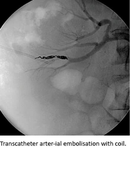 Trained interventional radiologists performed TAE in local analgesia via the common femoral artery. An initial renal angiography was obtained for identification of bleeding vessels and followed by embolisation if indicated and possible. The embolisation was performed