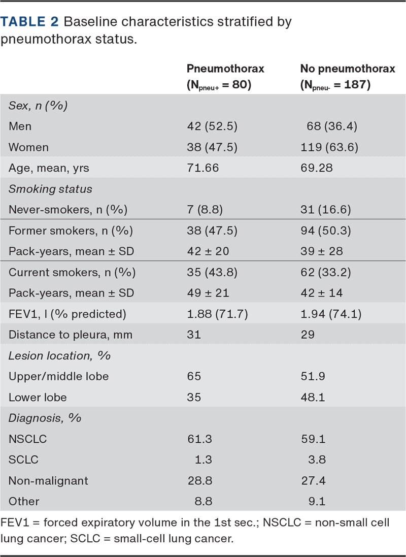 Pneumothorax occurred in 80 patients (30%) within 72 hours after CT-guided biopsy (Table 2). In multivariable analysis, sex was established as an independent predictor, whereas age was not significant (Supplementary table 1). Regarding the continuous variables, no significant notable differences were observed in FEV1, FEV1%, distance to pleura, pack-years among former smokers or current smokers.