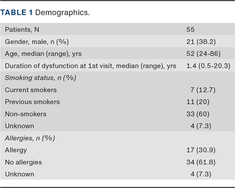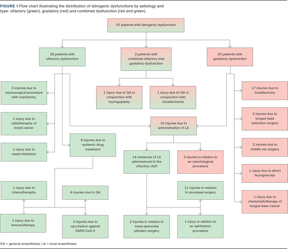 Among the more than 3,000 patients assessed at the Flavour Clinic, 55 met the inclusion criteria. Demographic data are presented in Table 1. Among the 28 patients with isolated OD, eight had a history of allergy, three were current smokers and eight were former smokers. The aetiologies of dysfunction are illustrated in Figure 1, categorised as isolated OD, GD or combined dysfunction.