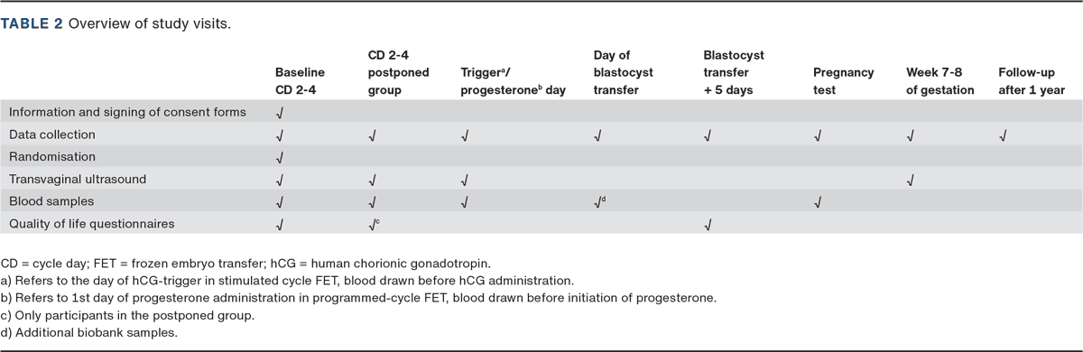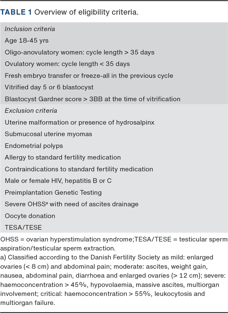 Eligible women (Table 1) are informed about the study by a doctor or study nurse, and those interested in participation are invited to a baseline visit on cycle days (CD) 2-4 of the first cycle following OPU.
