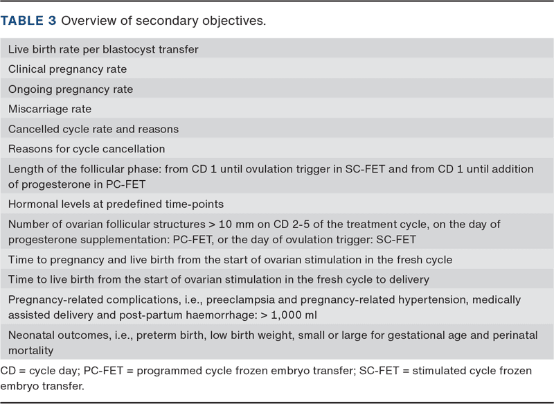 The rate of positive pregnancy tests, ongoing pregnancy, miscarriage and cancelled cycles will be calculated by risk difference with a 95% CI in the ITT, PP and PT analyses. Hormone levels will be compared with T-tests. The proportion of cystic ovarian structures > 10 mm will be compared by the χ2-test. Time to pregnancy will be compared by Kaplan-Meier plots and log-rank tests. Neonatal outcomes and pregnancy complications will be compared using Fisher’s exact test.