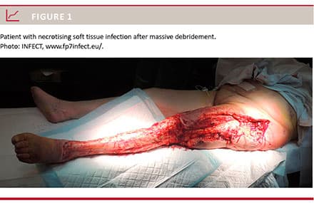 Necrotising soft tissue infection (NSTI), formerly known as necrotising fasciitis, is an aggressive progressing bacterial infection that often results in severe morbidity (e.g. organ failure and amputation) and is associated with high mortality rates (20-40%) [1]. Some of the patients have comorbidities predisposing for NSTI [2]. The most common microbiological finding is mixed flora or group-A streptococcus (GAS) infection [3].