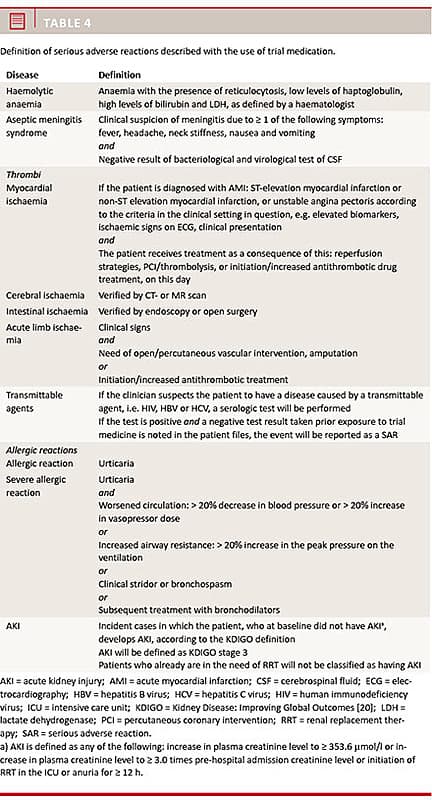 Patients are withdrawn from the trial protocol if a SAR or a suspected unexpected serious adverse reaction (SUSAR) occurs. Patients withdrawn from the trial receive the standard protocol treatment for NSTI with the exception of IVIG. A list of SARs is presented in Table 3. The trial definition of SARs is seen in Table 4. Adverse events (AEs) and serious adverse events (SAEs) are not recorded as entities because the majority of ICU patients experience several SAEs during their critical illness.