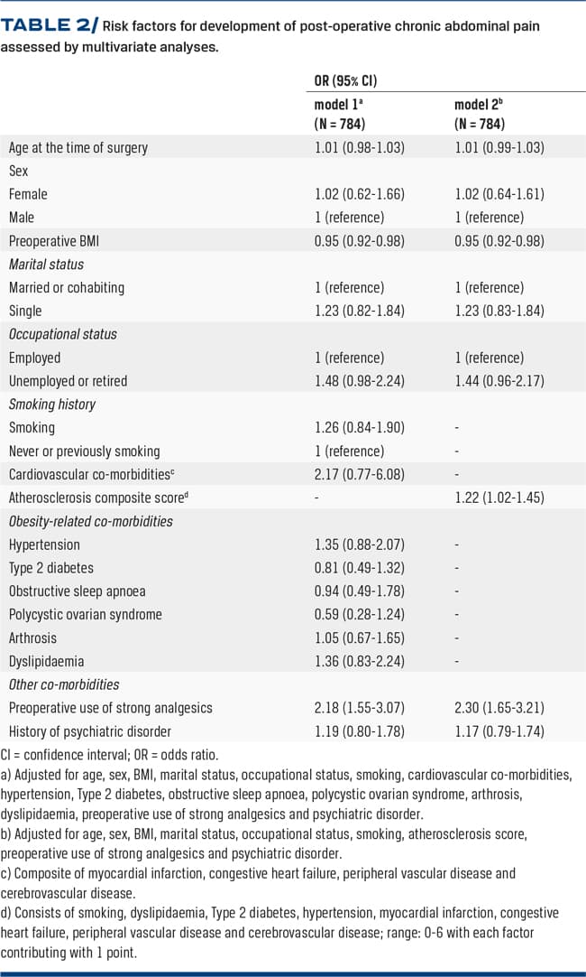 METHODS: This was a retrospective, single-centre cohort study including all patients with LRYGB surgery from 2010 through 2015. Data from multiple registries, medical records and a questionnaire were used. The risk of chronic abdominal pain was analysed using multivariate logistic regression.
