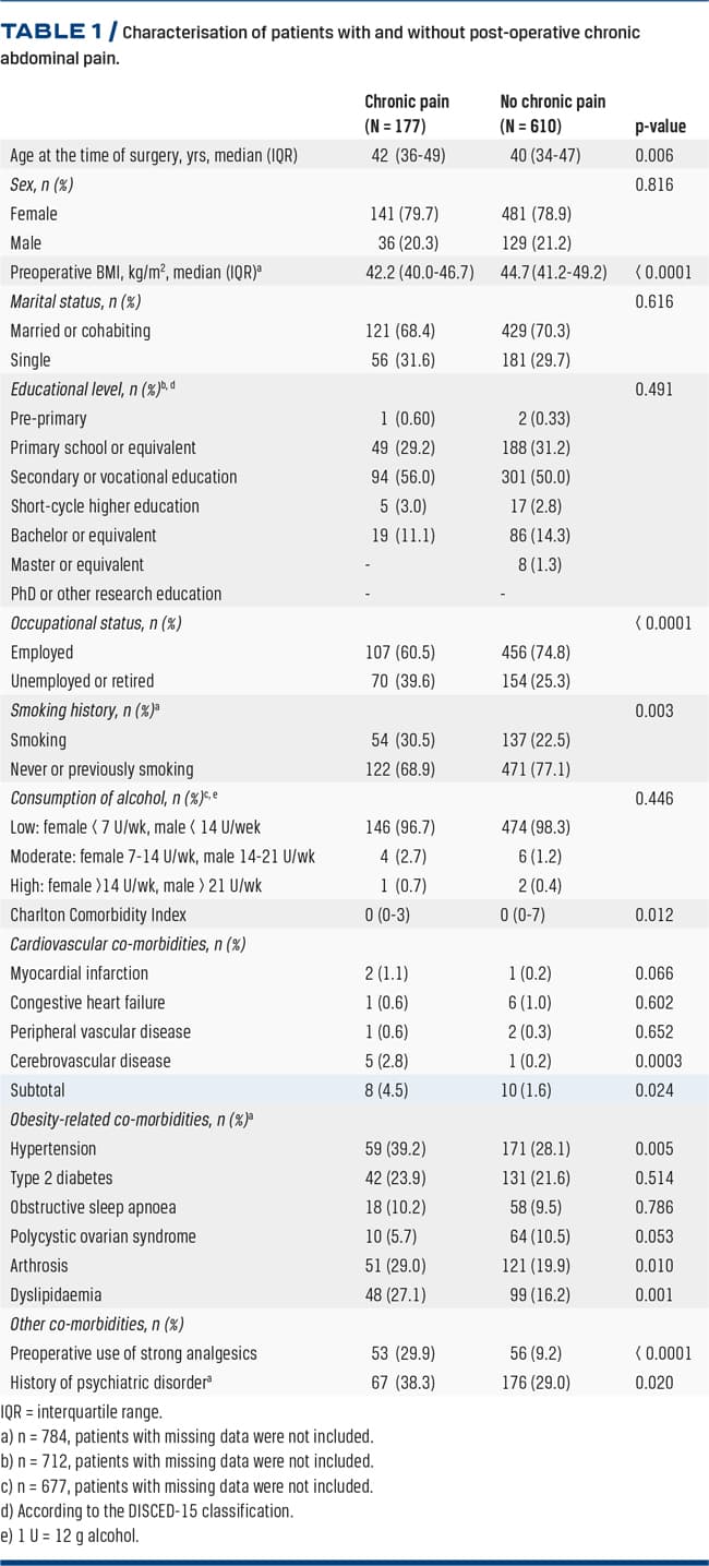 Chronic abdominal pain was defined as a composite of post-operative initiation or escalation of strong analgesics (including opioids or opioid analogues, gabapentin, pregabalin or tricyclic antidepressants), a diagnosis with chronic pain, a referral to a specialised pain clinic or if patients reported having abdominal pain more than twice weekly within the past month in the study questionnaire.