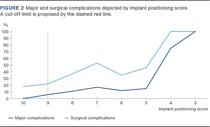 The TBWs were rated with a median score of eight points (range: 3-10) (Table 1). A total of 11.8% had major complications. There were no major complications with a ten-point IMPO score, 6% with a nine-point IMPO score; and in 11-17%, the IMPO score was 5-8 points. This revealed a clear relation between a higher score and fewer post-operative major complications (p < 0.001). Surgical complications (addition of TBW fixation loss) were seen in 30%, demonstrating a similar relationship between a higher IMPO score and fewer complications (p < 0.001).