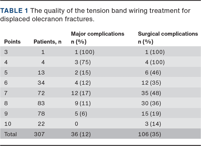 The number of imperfections was converted into an IMPO score of ten points, subtracting the number of imperfections; for example, if three imperfections were recorded, a seven-point IMPO score was assigned. Major complications were defined as any reoperation within eight weeks, reoperation due to deep infection, non-union or reosteosynthesis. Surgical complications were defined as major complications and the loss of TBW fixation. Minor complications included simple removal of hardware, defined as removal eight weeks after surgery due to discomfort in the elbow because of the osteosynthetic material.
