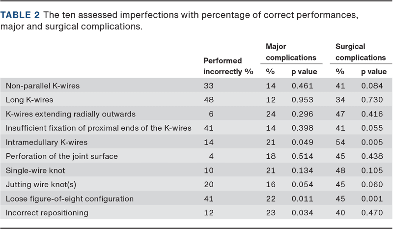 Among the ten IMPO assessments, the most common errors were too long K-wires (48%), insufficient fixation of proximal ends of the K-wires (41%) and a loose figure-of-eight configuration (41%) (Table 2). An association was observed between an intramedullary K-wire, a loose figure-of-eight configuration, incorrect repositioning and major complications. For surgical complications, similar specific associations were observed but the incorrect repositioning was replaced with insufficient fixation of proximal ends of the K-wires.