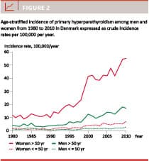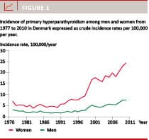 This study reveals a continuing increase in the incidence rates of PHPT in Denmark during the 2000-2010 period. The increase was seen in both men and women, especially above 50 years of age and it was more pronounced for women. It should be noted that incidence rates were only increasing when the entire period was considered, as the fluctuations in incidence from one year to the next were rather large. A similar pattern was seen in Scotland [5]. In the Scottish study [5], it was suggested that these fluctuations could be season-related, but there are still no studies that definitively confirms this. The reason for these fluctuations thus remains unclear. Unknown aetiologic factors probably play a role [5] and need to be clarified. In our study, there was no seasonal variation. Two months (July and December) had a lower incidence of newly diagnosed cases, but both are holiday months, and a lower activity in the health-care system may explain the lower frequency observed. For example, December was followed by a higher incidence of newly diagnosed cases in January. Among women, there were a few more new cases in the months of September through November than in the months of February through April. However, this could not be seen in men.