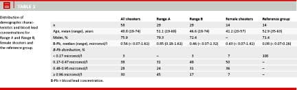 Table 1 provides an overview of overall shooter and reference group characteristics. On average, shooters at Range B were five years younger than those at Range A and reference group individuals. The proportion of male shooters at Range A was approximately 80%; at Range B and in the reference group, it was around 70%. Shooting was the only relevant lead exposure. Overall, the median B-Pb was 0.56 micromol/l, ranging from < 0.07 micromol/l (below detection level) to 1.61 micromol/l. The median B-Pb was 0.85 micromol/l at Range A and 0.46 micromol/l at Range B. The proportion of shooters with a B-Pb above 0.96 micromol/l was 45% at Range A and 17% at Range B. Among female shooters, six had a B-Pb above 0.48 micromol/l, seven between 0.17 and 0.48 micromol/l and one below 0.17 micromol/l. Median and average B-Pb in the reference group was 0.08 micromol/l and all individuals had B-Pb values below 0.17 micromol/l.