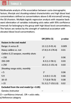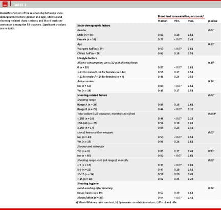 Table 2 shows risk factors associated with B-Pb in the bivariate analyses. Gender, shooting range, total number of monthly shots using calibre 0.22 weapons, periodical firing of heavy calibre weapons (0.32 and above) and number of monthly shooting range visits were all statistically significantly associated with increased B-Pb. Age, smoking, alcohol intake, hand-washing after shooting and being a shooting instructor showed no statistically significant association with B-Pb, although there was a tendency towards a higher B-Pb among shooting instructors. The majority (24 out of 28) of shooters who used air guns also used gunpowder-propelled weapons. Among the four shooters exclusively using airguns, B-Pb were 0.51 (instructor), 0.21, 0.18 and below 0.07 micromol/l.