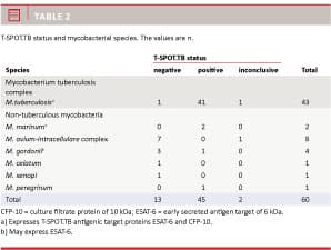 In four cases in which NTM infections were confirmed microbiologically, the T-SPOT.TB was positive (two patients infected with M. marinum and two infected with M. peregrinum and M. gordonii, respectively). M. marinum expresses the test target antigenic proteins ESAT-6 and CFP-10, and positive results were to be expected. M. gordonii has been reported to express ESAT-6 in some cases, which may very well lead to cross reactivity in T-SPOT.TB as well as in QFN-GIT [20]. The case of M. peregrinum may be considered as latent co-infection with M. tuberculosis.