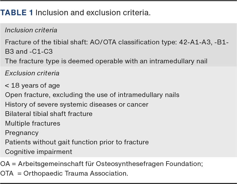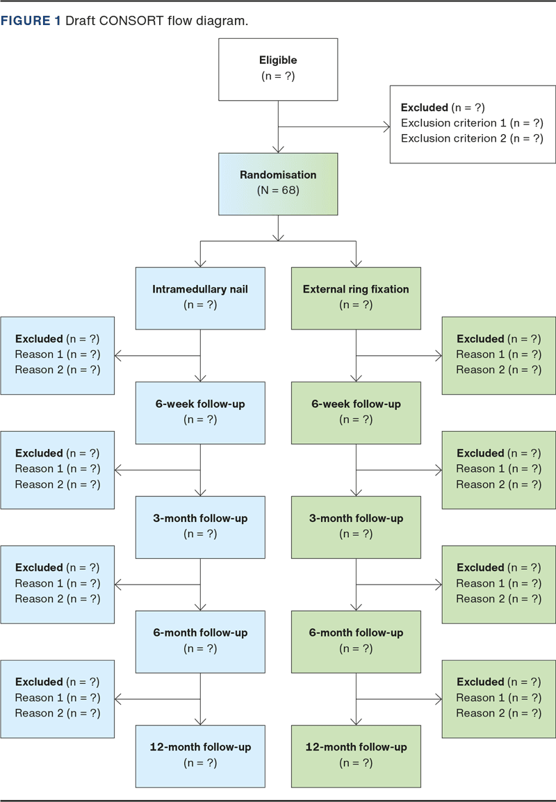Patients who meet the criteria outlined in Table 1 will be included by consecutive sampling and randomised (1:1) to the hospitals’ standard surgical intramedullary nailing procedure or to external ring fixation.